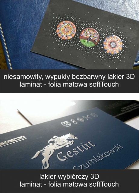 • lakier 3D (na laminowanej matowo powierzchni część grafiki jest zadrukowana grubą warstwą lakieru wyczuwalną pod palcem)